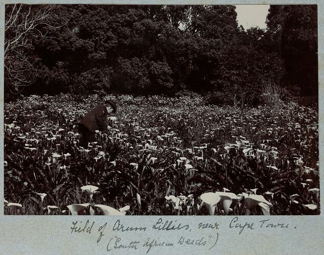 A man in a field of Arum lillies (South African Weeds), Cape Town, South Africa, circa 1902.