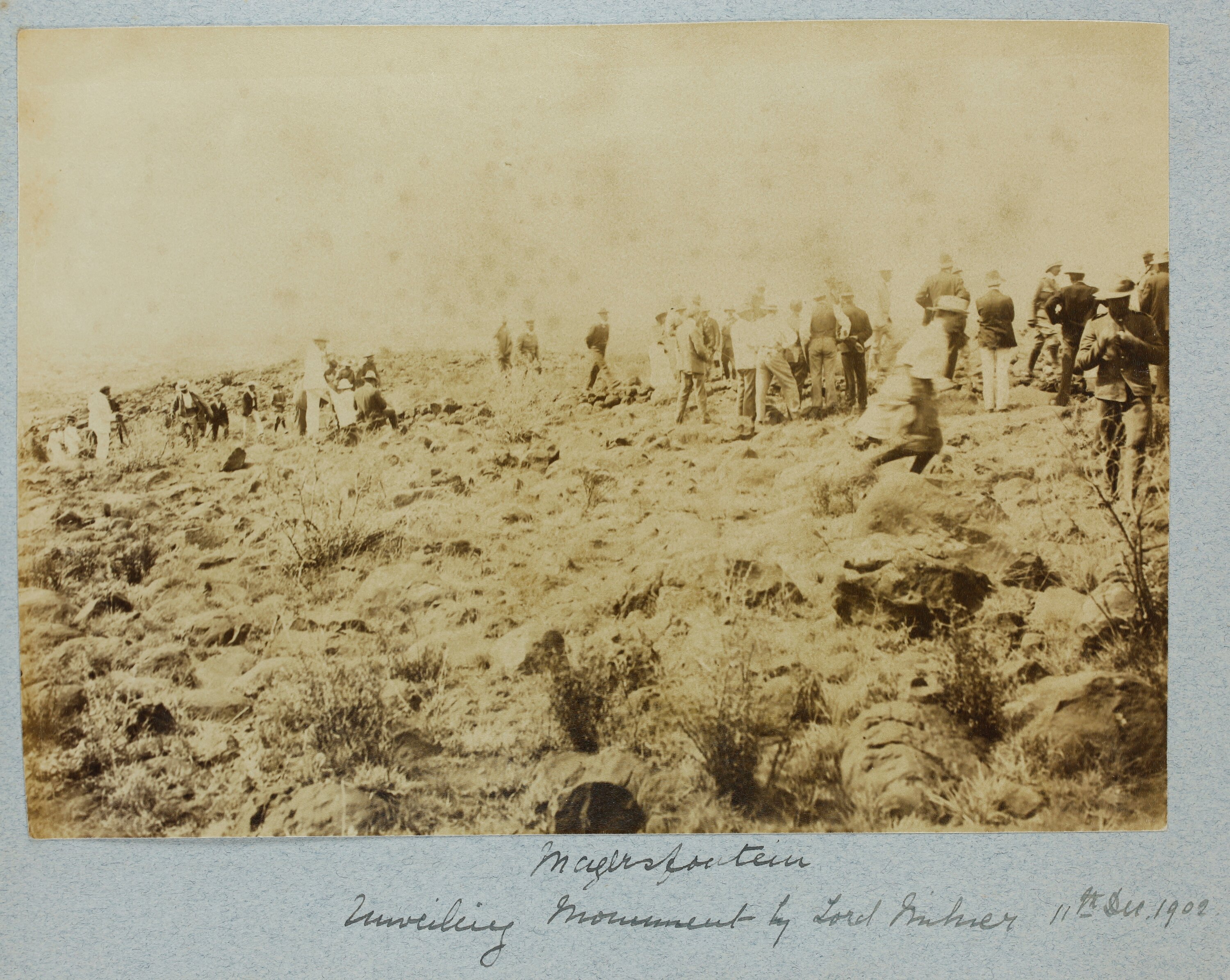 Hand written in black ink on the album page; 'Magersfontein / Unveiling Monument by Lord Milner 11th Dec, 1902''