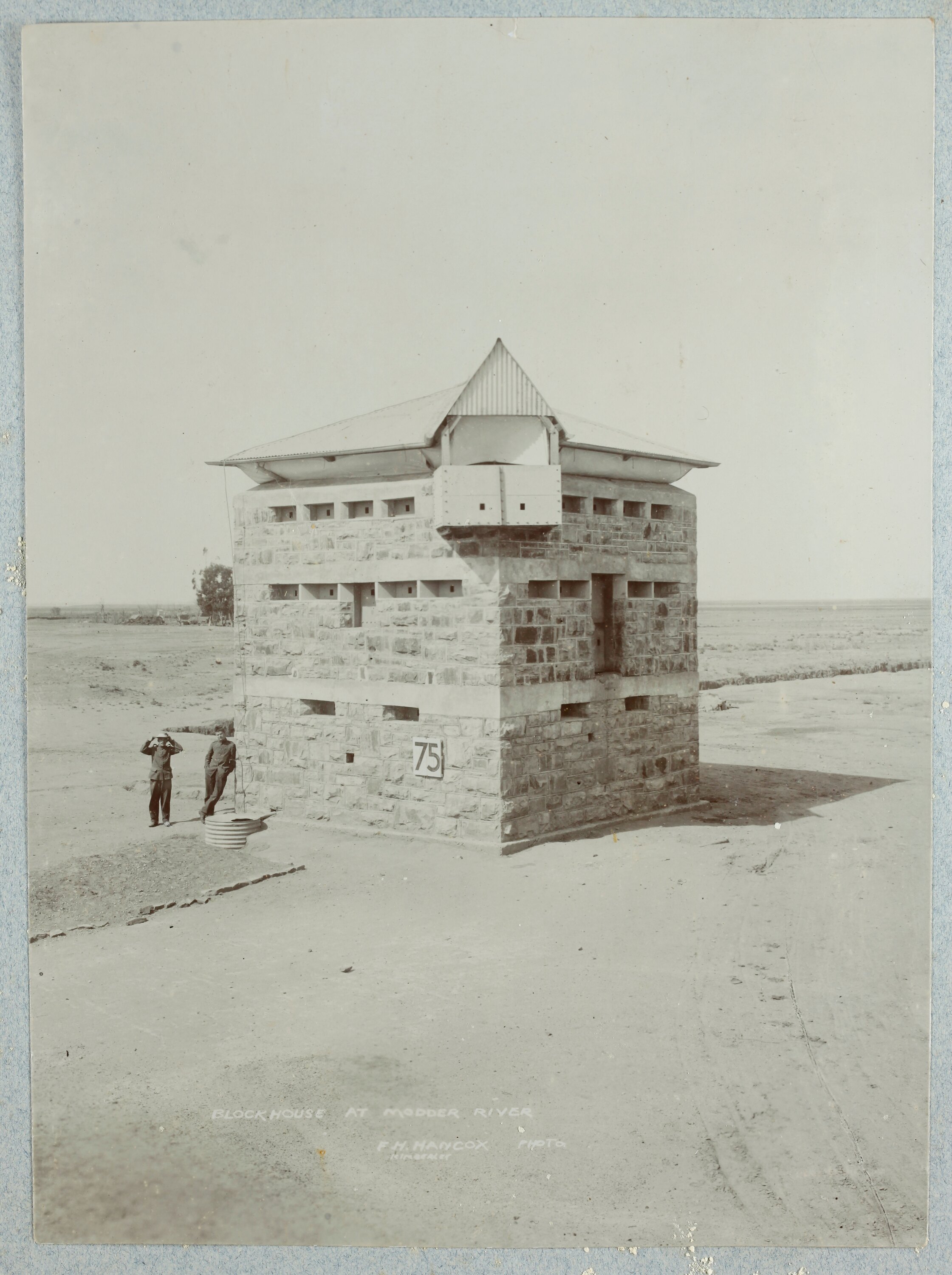 Hand written in white on the photograph; 'BLOCKHOUSE AT MODDER RIVER / F.H. HANCOX PHOTO / [ILLEG]'