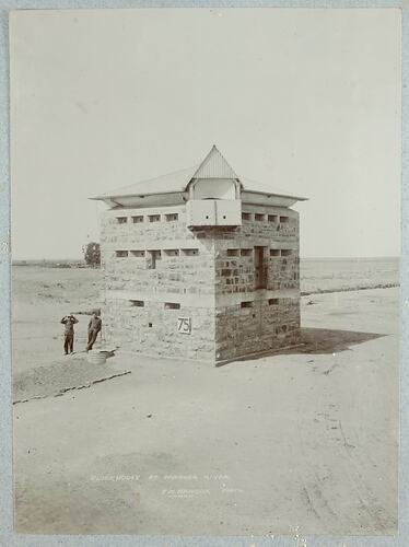 Two men standing beside a blockhouse ( a small, isolated fort in the form of a single building). South Africa, 1900.