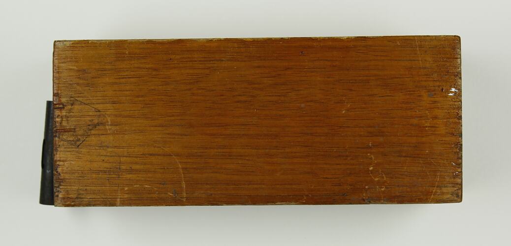 Rectangular brown block of wood, polished on one of the larger faces, with three screw holes in another unpolished face. A paper clip is screwed on one of the smaller faces. The clip has one of its handles missing.