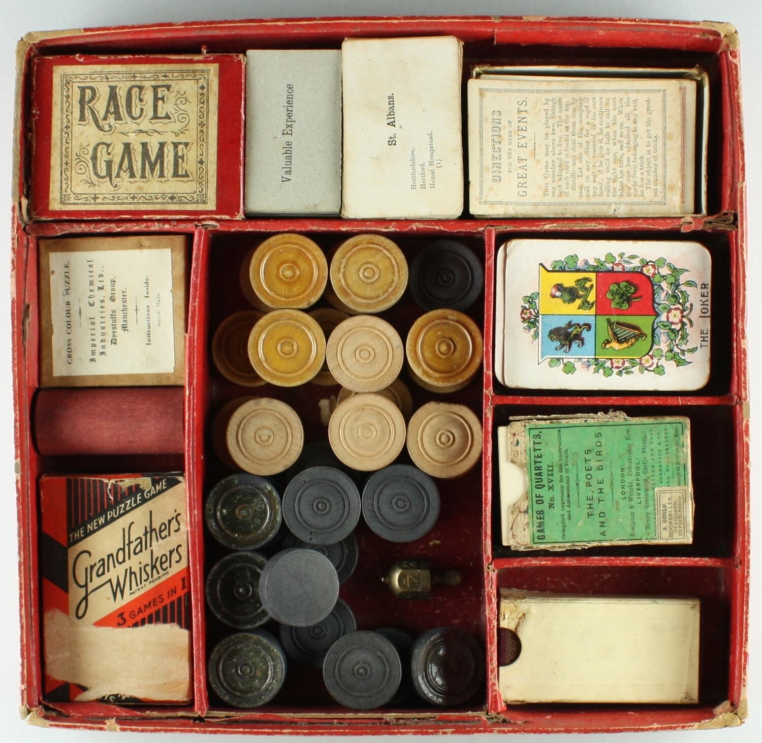 Boxed collection of games, including card games, a race game, Ludo and checkers. Originally belonging to the donor's grandfather, it was passed down and played with by his children, grandchildren and great grandchildren. Some games date to the 19th century, inluding 'Games of Quartetts'; 'Grandfather's Whiskers' appears to date 1920s-30s.