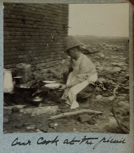 Hand written in black ink on the album page; 'Our cook at the picnic'