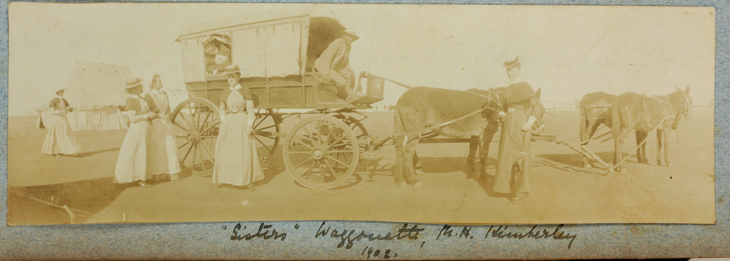 Hand written in black ink on the album page; '"Sisters" Waggonette, M.H. Kimberley / 1902.'