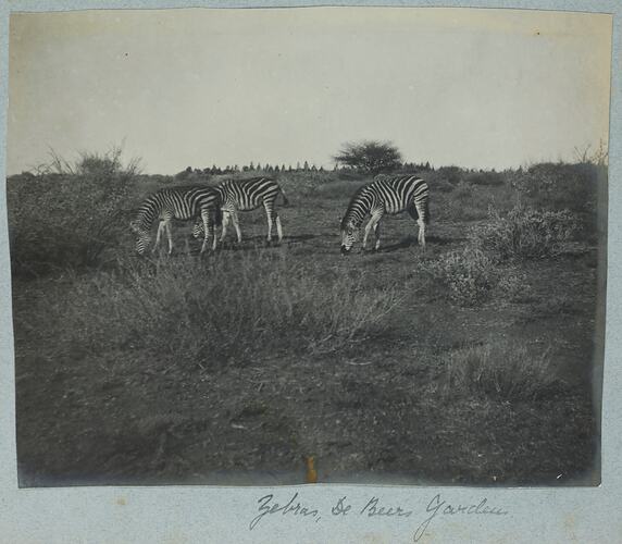 Hand written in black ink on the album page; 'Zebras, De Beers Garden.'