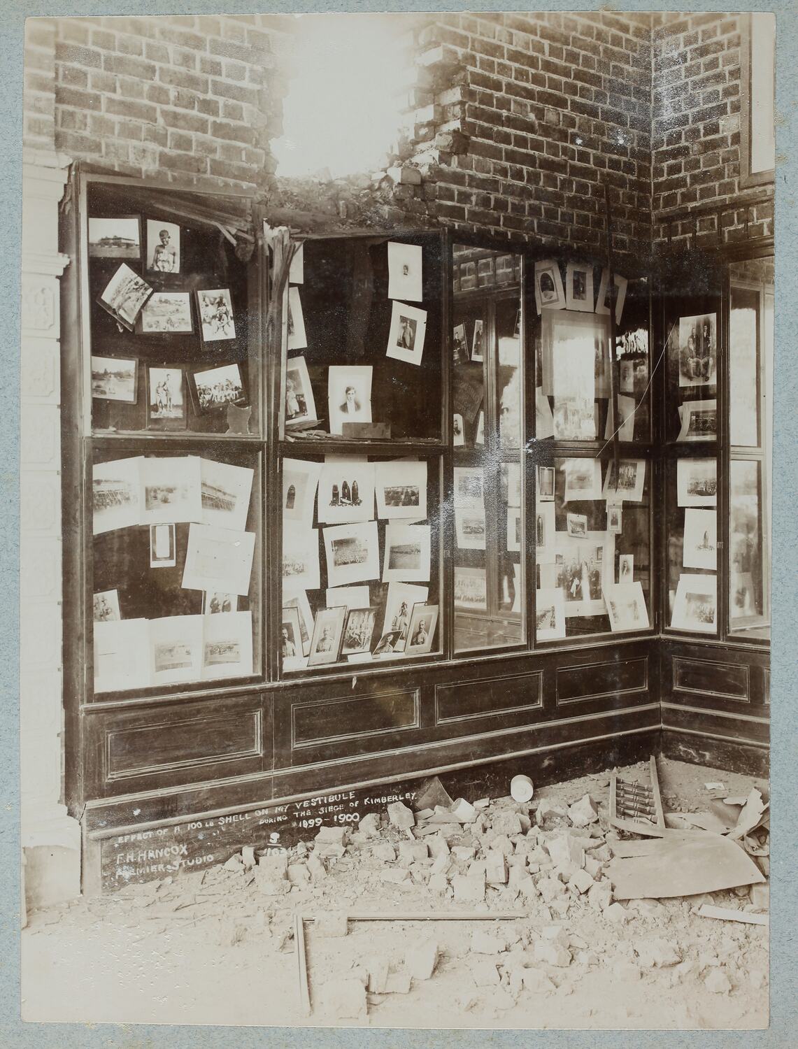 Hand written in white on the photograph; 'EFFECT OF A 100 LB SHELL ON MY VESTIBULE / DURING THE SIEGE OF KIMBERLEY. / 1899 - 1900 / F.H. HANCOX / PREMIER STUDIO'