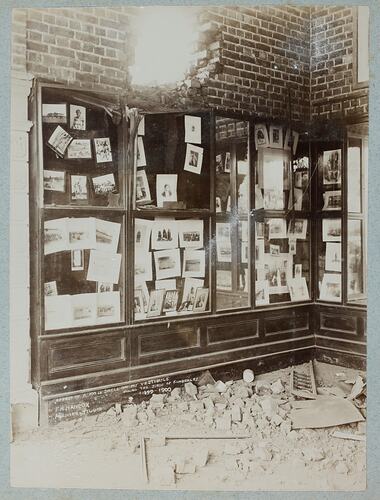 Exterior view of a photographic studio showing destruction caused by shelling during the Siege of Kimberley, South Africa, circa 1900.