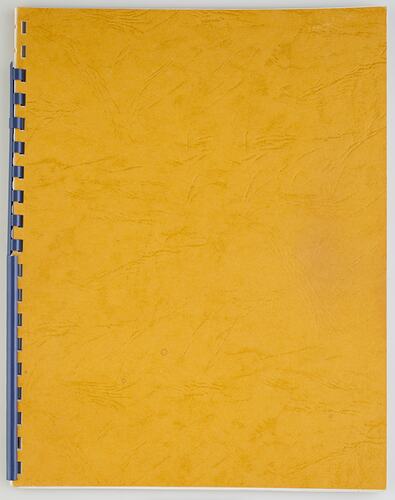 16 page booklet with a yellow card cover, and blue plastic comb binding. Original colour photographs are inserted in various places of the text, adhered to the pages. Pages are printed with text only on one side.