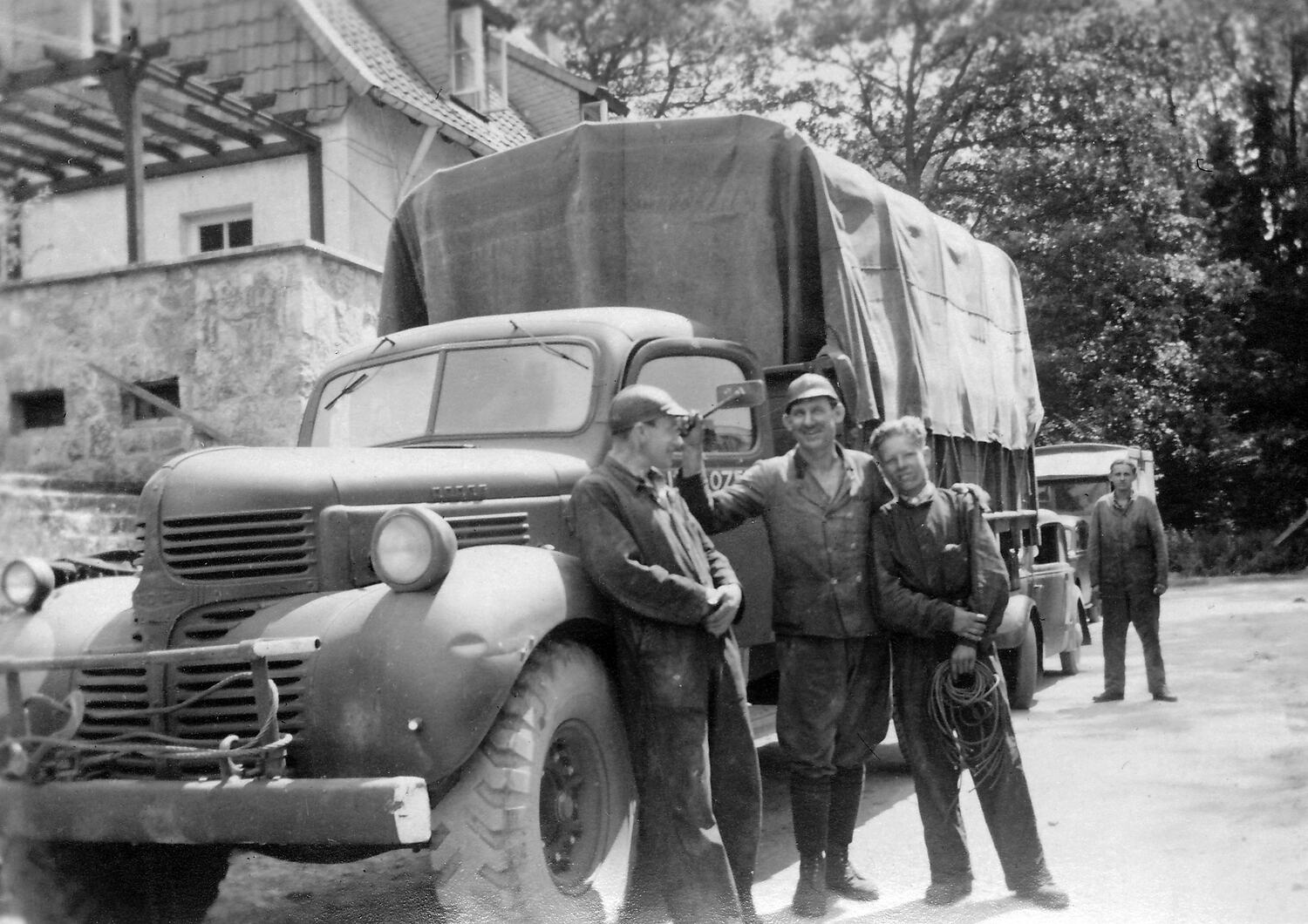 Black and white photograph of three men standing next to an army truck outside a building with another man in the background. Three of the men are in mechanics' overalls.