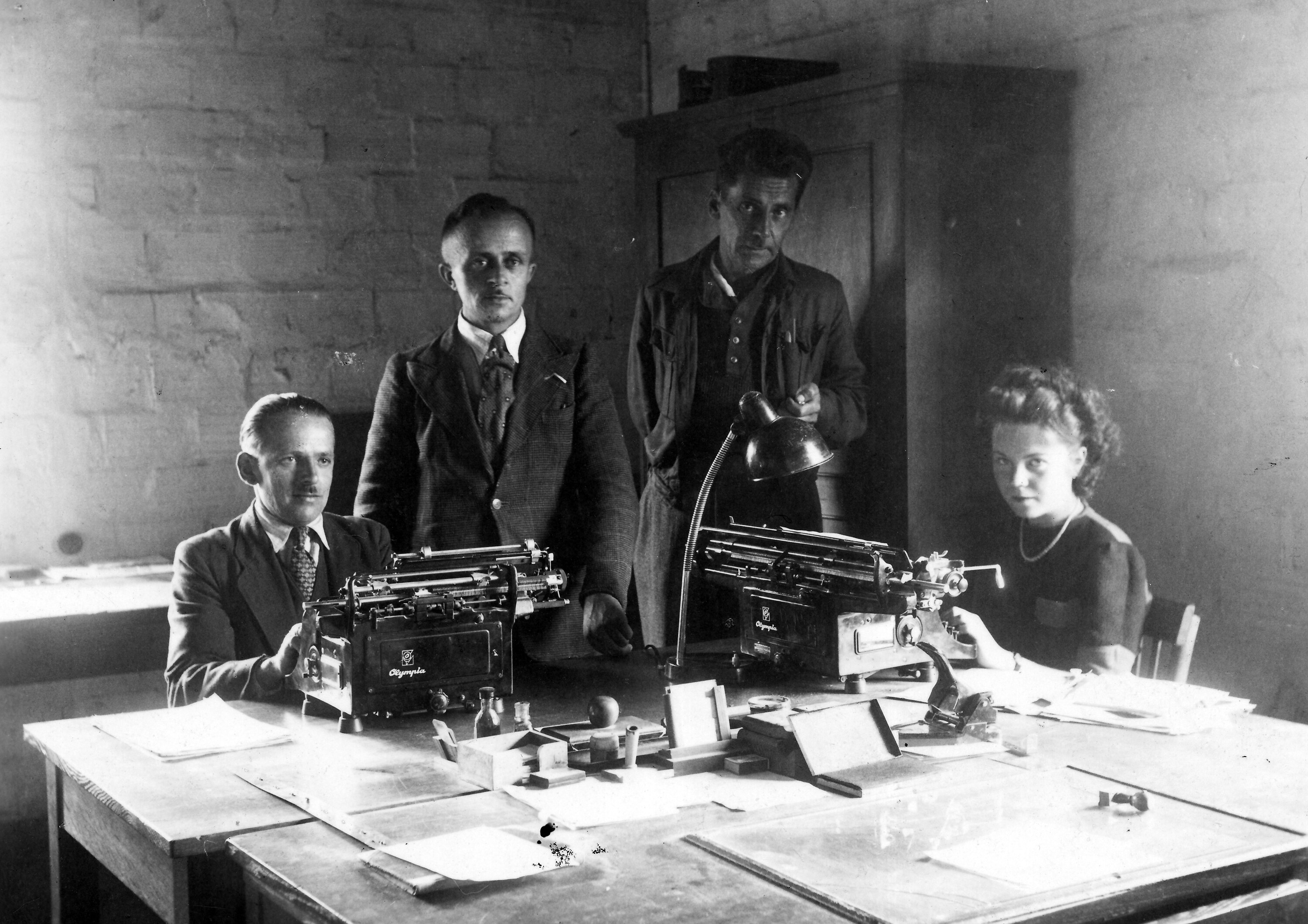 Black and white photograph showing an office interior, a desk with two men standing and a man and a woman seated at typewriters.
