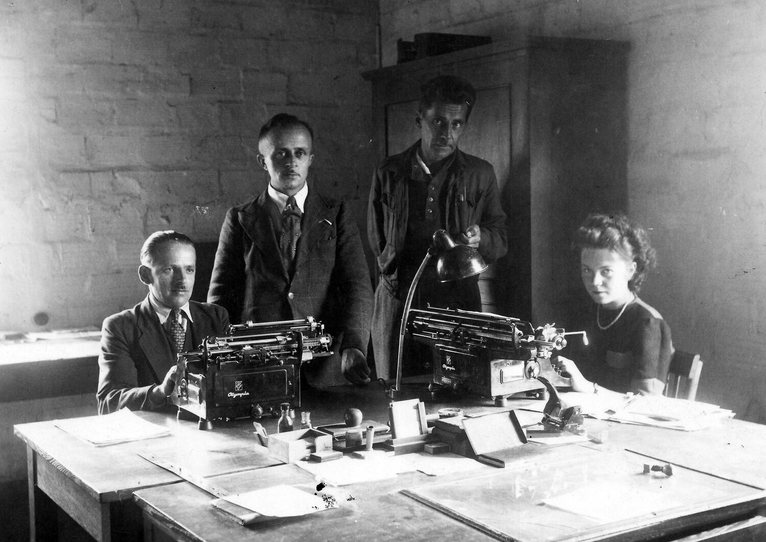 Black and white photograph showing an office interior, a desk with two men standing and a man and a woman seated at typewriters. This office was located at the A1 Heerte displaced persons camp, Salzgitter region, Germany after the end of World War II, 1946. Camp Commandant Mikolaj Lawrow is standing second from the right with his Deputy Dulal on his right.