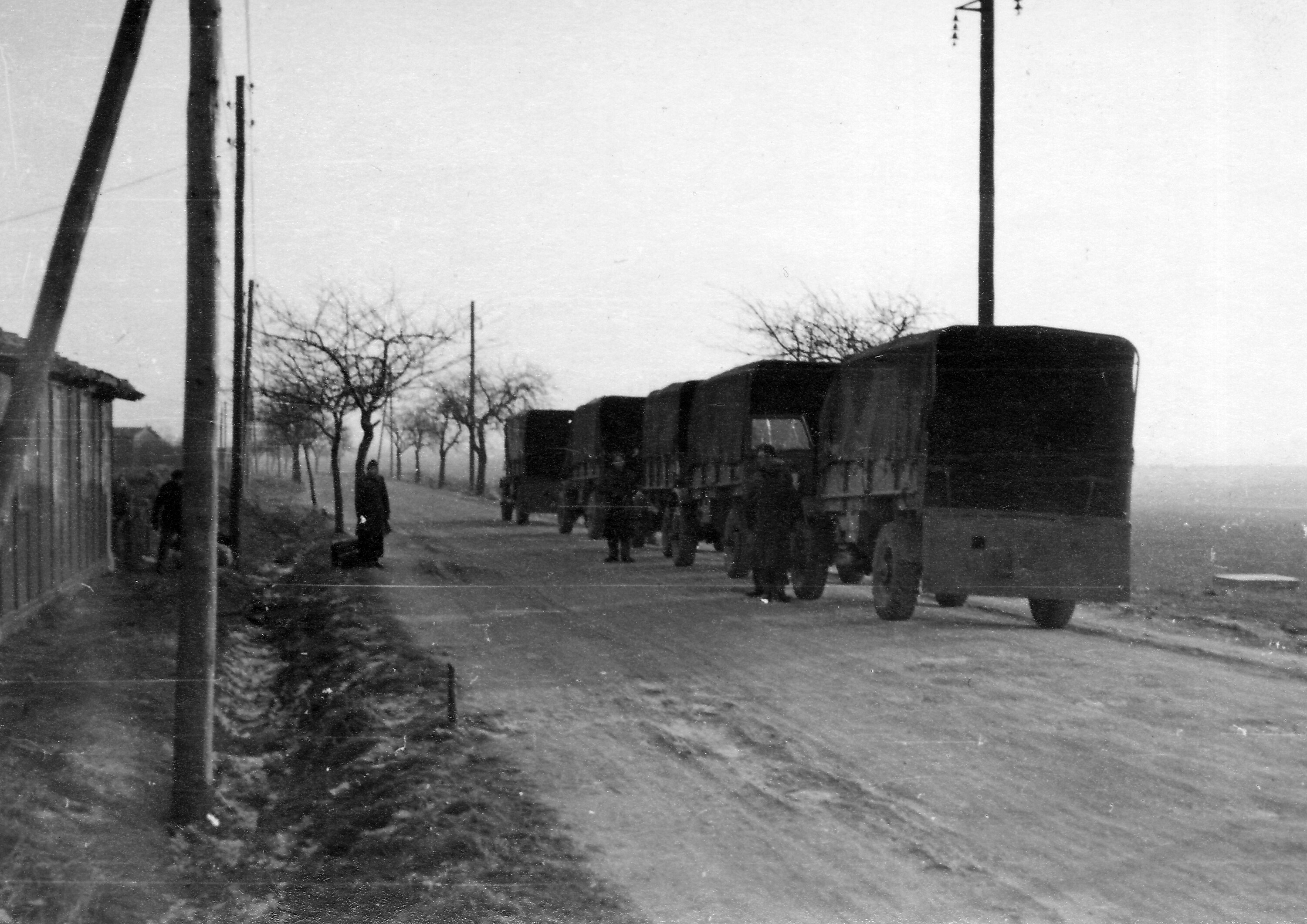 Black and white photograph of trucks driving along a road in the Salzgitter region of Germany.