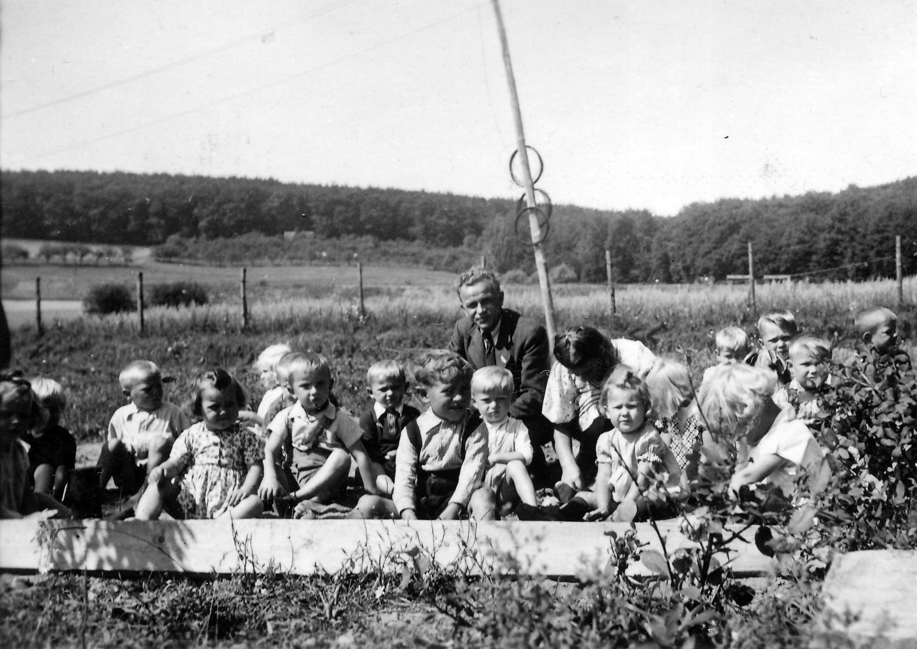Black and white photograph of a group of children seated outdoors with a man and a woman, Germany.