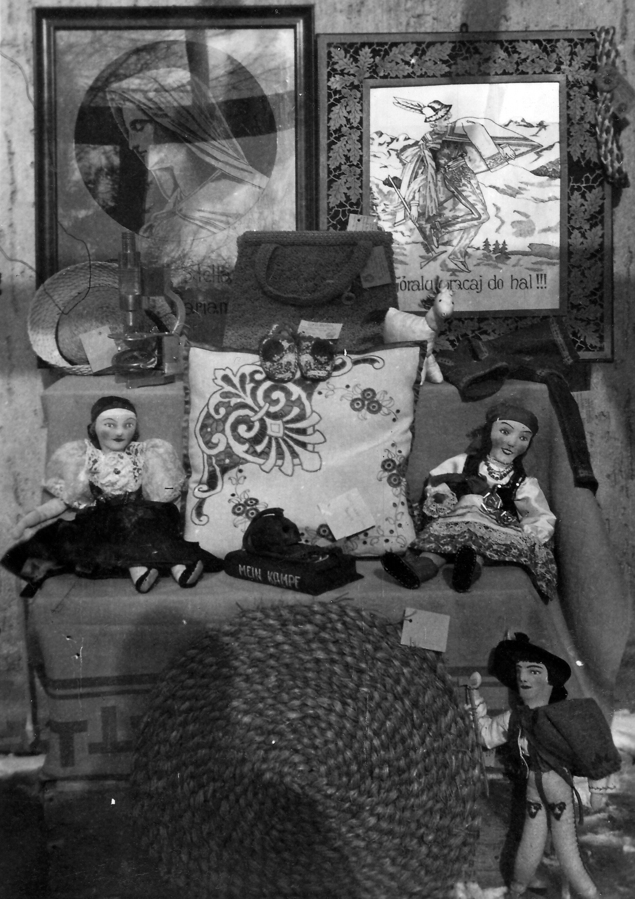 Black and white photograph of a group of craft works on display. They include two framed works , folk dolls, cushion, coiled mat, bag and what appears to be a box with 'Mein Kampf' written on the side.