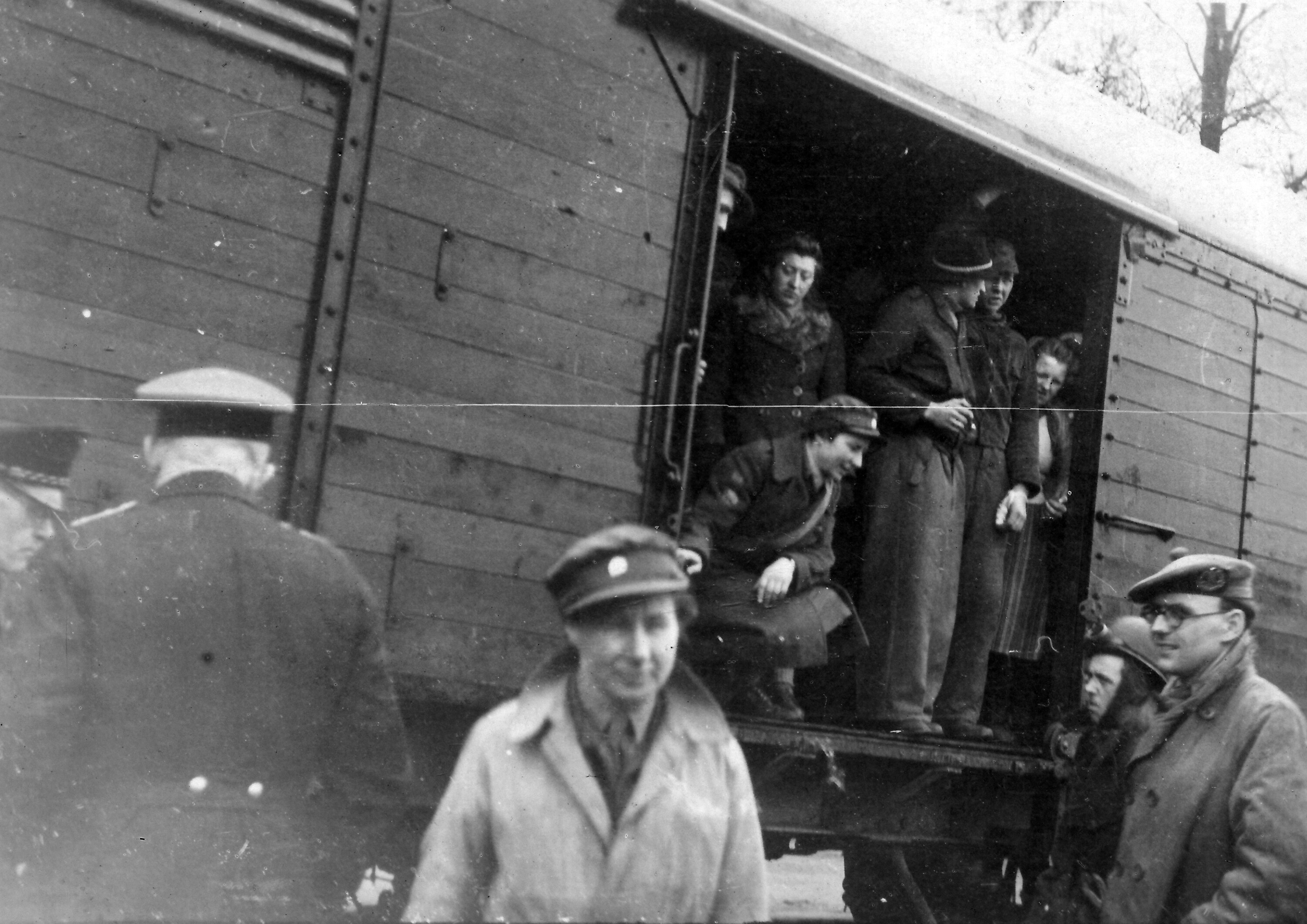 Black and white photograph of a group of displaced persons camp workers standing inside and outside a train carriage, at Heerte Railway Station in the Salzgitter region of Germany, 1946. They are possibly coordinating the repatriation of Polish displaced persons and Stella Cunliffe, English Guide International Service Team leader is in the foreground facing the camera.
