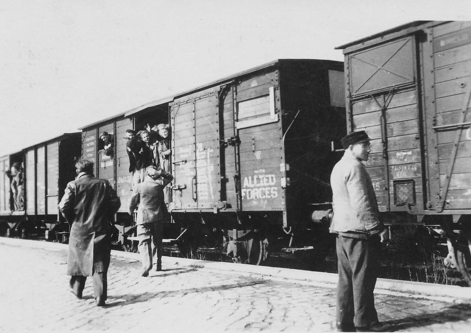 Black and white photograph of a group of Polish displaced persons on board a train marked 'Allied Forces' at Heerte Railway Station in the Salzgitter region of Germany, 1946. They are in the process of being repatriated from camps in the Salzgitter region.