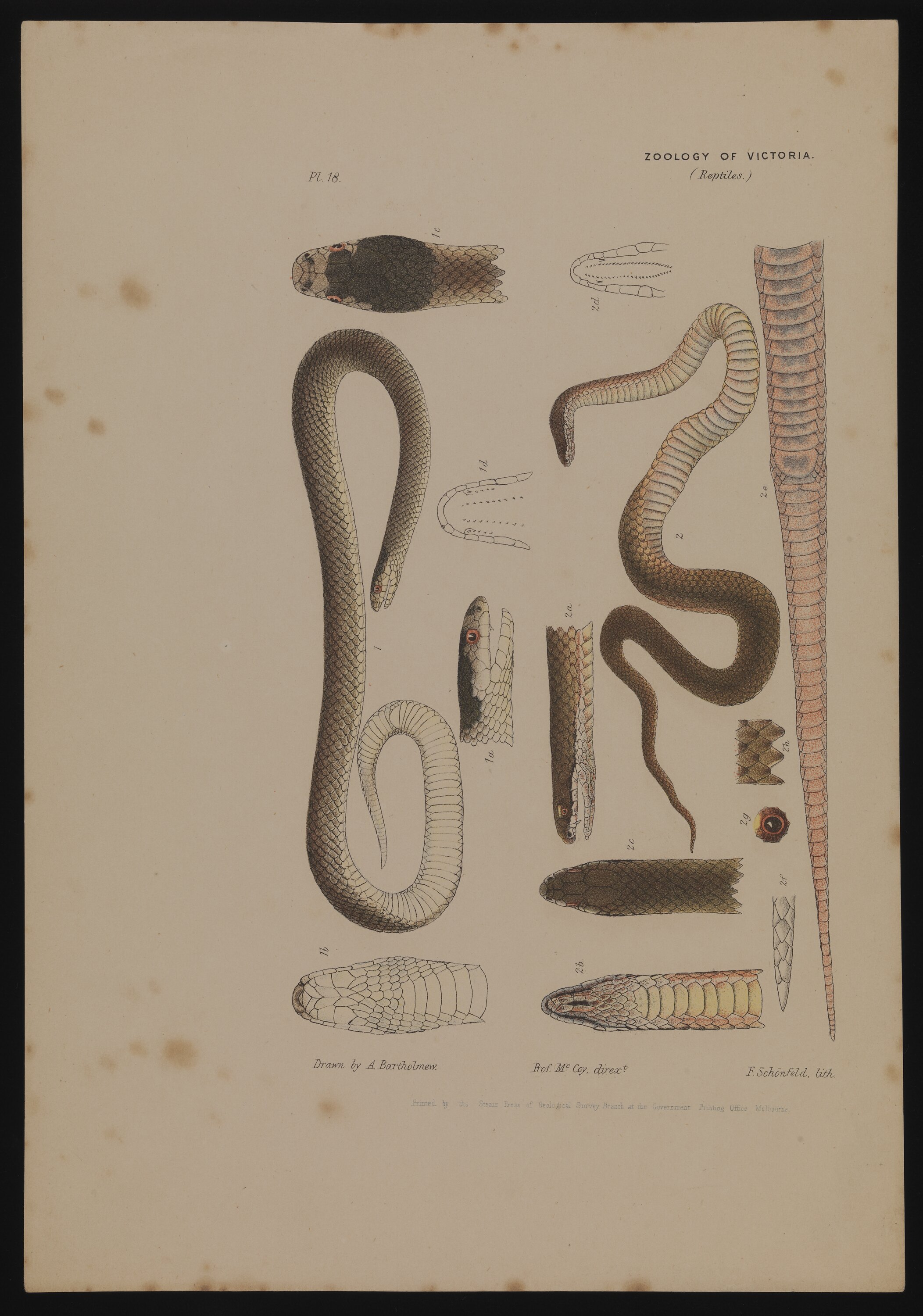 Full colour proof of a White-lipped Snake, Drysdalia coronoides, and a Little Whip Snake, Suta flagellum, by Arthur Bartholomew, with Frederick Schoenfeld as lithographer. This work was commissioned by Frederick McCoy, the first Director of The National Museum of Victoria, for Plate 11 in The Prodromus of the Zoology of Victoria; Figures and descriptions of the living species of all classes of the Victoria indigenous animals. McCoy originally referred to these species as Hoplocephalus flagellum, The Little Whip Snake, and Hoplocephalus coronoides, The White-lipped Snake.