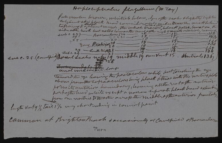 Descriptive notes on a Little Whip Snake, Suta flagellum. Frederick McCoy, the first Director of The National Museum of Victoria, prepared these notes for Plate 11 in The Prodromus of the Zoology of Victoria; Figures and descriptions of the living species of all classes of the Victoria indigenous animals. He originally referred to this species as Hoplocephalus flagellum, The Little Whip Snake.