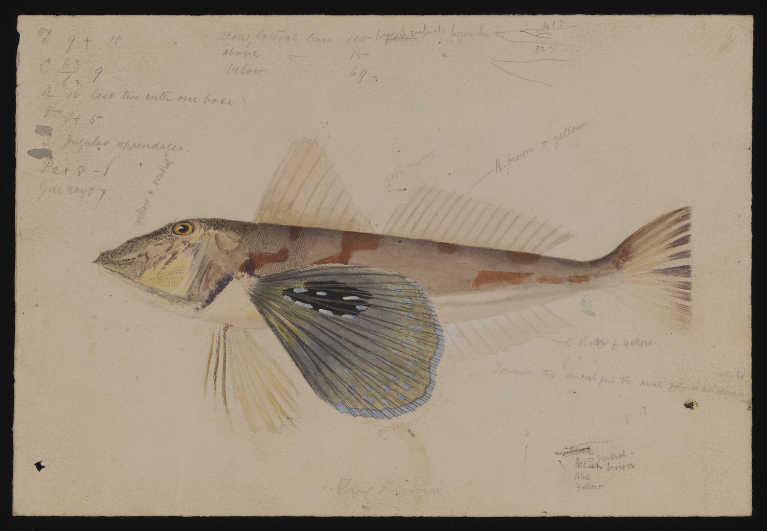 Watercolour illustration of a Red Gurnard, Chelidonichthys kumu, by Arthur Bartholomew. This work was commissioned by Frederick McCoy, the first Director of The National Museum of Victoria, for Plate 6 in 'The Prodromus of the Zoology of Victoria; Figures and descriptions of the living species of all classes of the Victoria indigenous animals'. The illustration was based on a specimen collected in Hobsons Bay, Port Phillip, in August 1864, referred to by McCoy as Trigla kumu, The Kumu Gurnard.