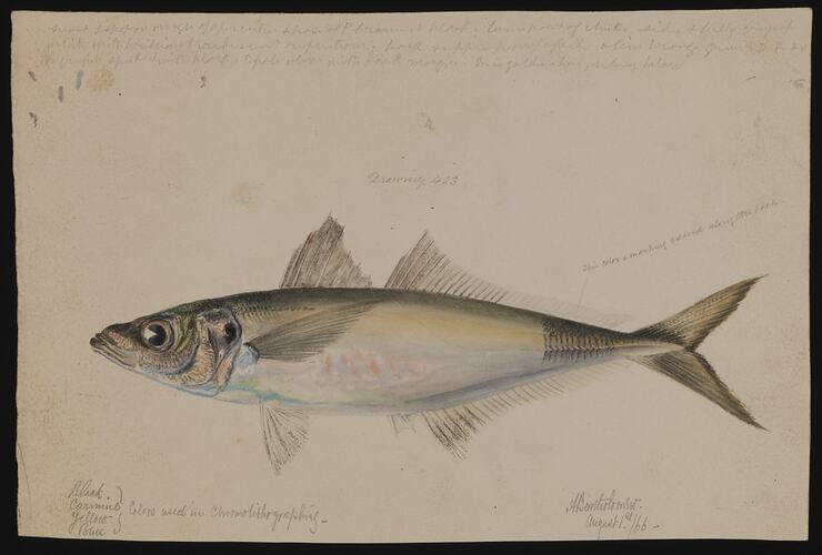 Watercolour illustration of a Common Jack Mackeral, Trachurus declivis, by Arthur Bartholomew, 1866, finally published as Plate 18 in The Prodromus of the Zoology of Victoria by Frederick McCoy.