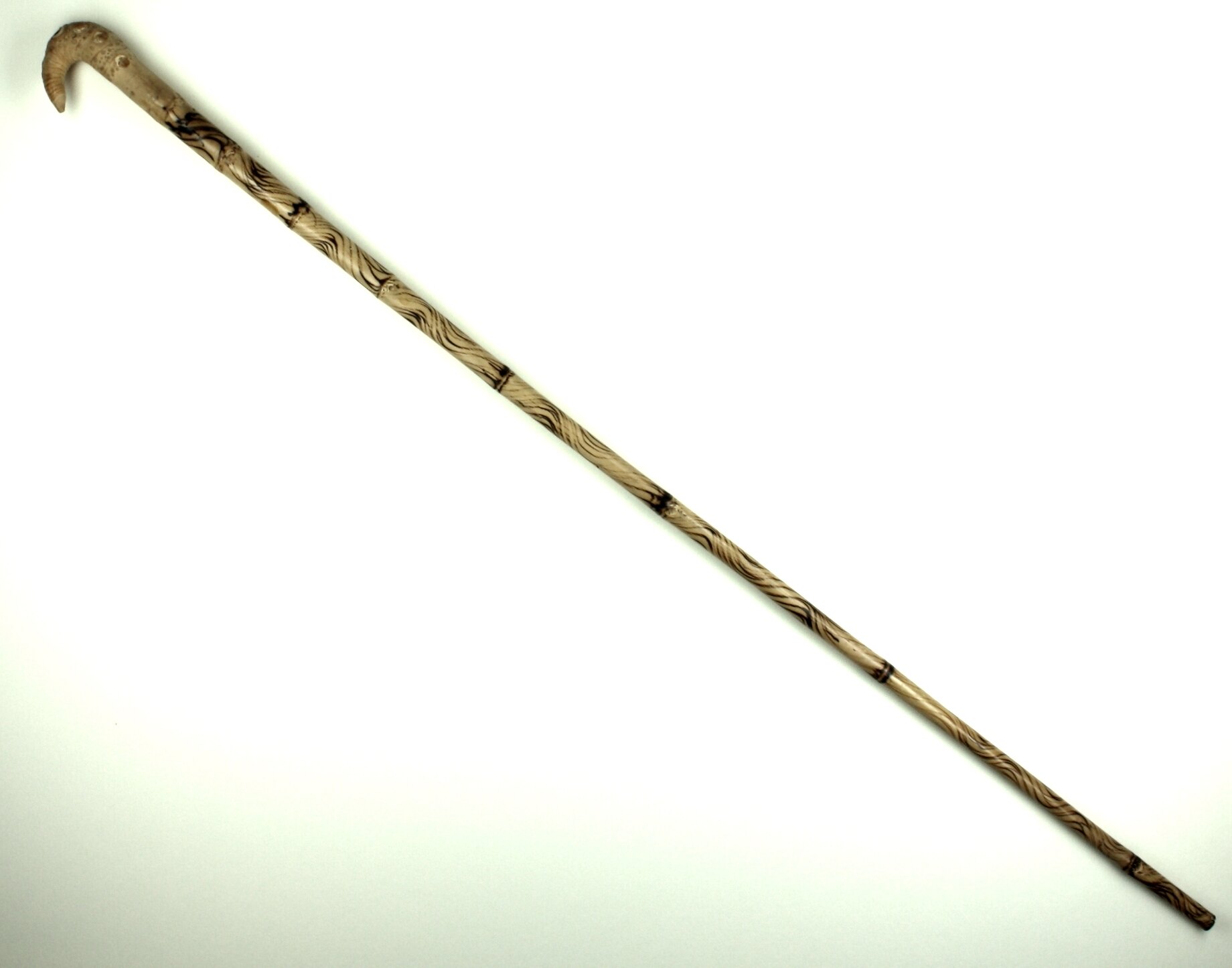 Long thin walking stick, possibly made from bamboo. It has dark brown patterns of wavy lines and intermittent stripes. The small handle is hooked in a paler wood and features a dot pattern. The stick has a polished finish except for the handle.