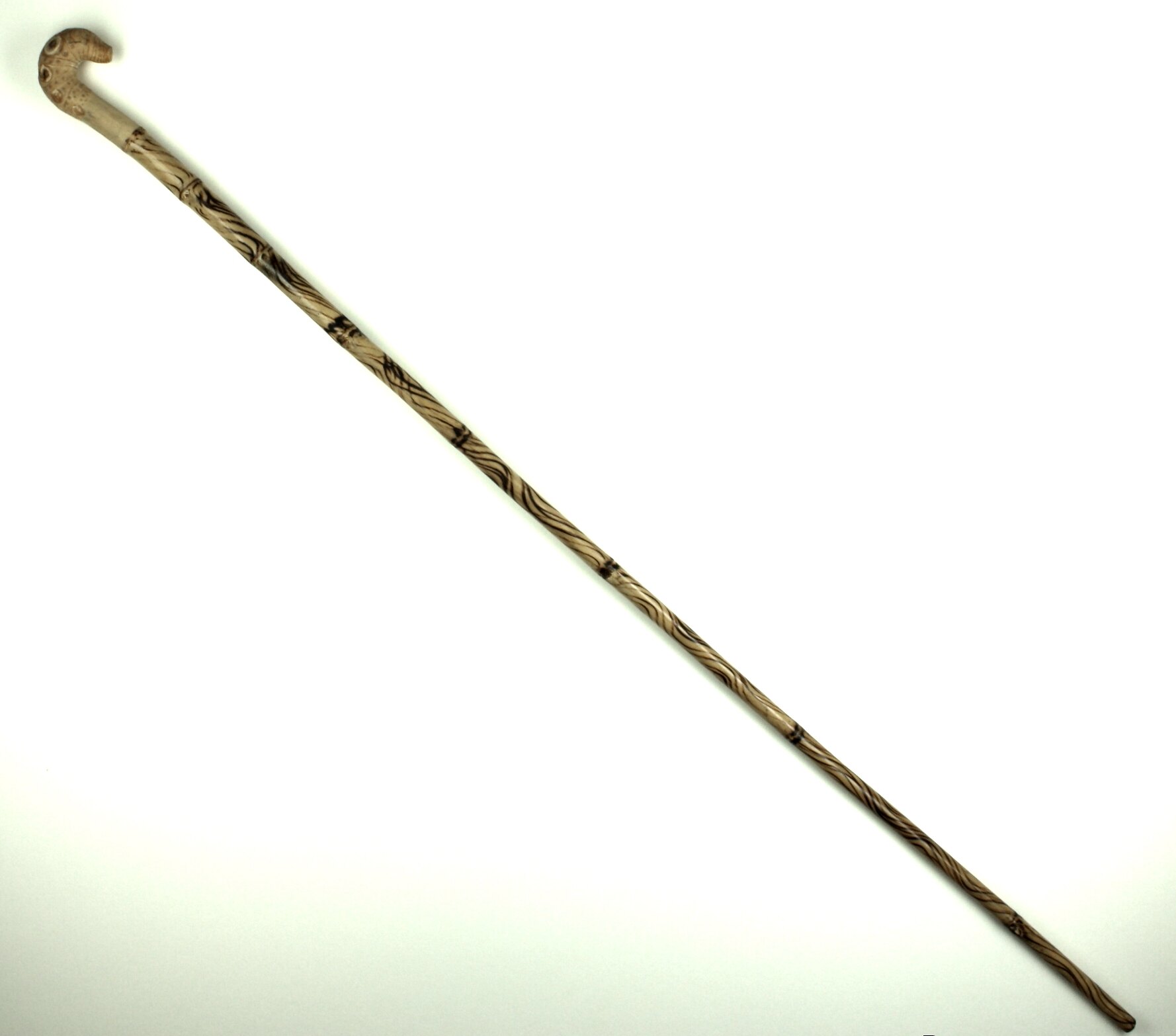 Long thin walking stick, possibly made from bamboo. It has dark brown patterns of wavy lines and intermittent stripes. The small handle is hooked in a paler wood and features a dot pattern. The stick has a polished finish except for the handle.