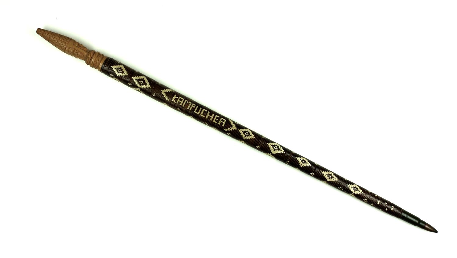 Thin wooden stick which has a woven brown fibre cover with pale diamond patterning. At one end is a tan coloured pointed handle, carved with four faces and an etched point. The other end has a long pointed metal bullet with a green shell.