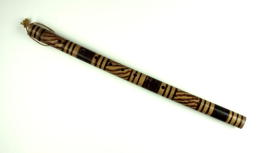 Rounded tubular flute made from bamboo. It has a series of striped patterns in dark brown.There are 8 finger holes down one side, 2 holes at one end with a yellow knotted string threaded through to form a hook or handle. There are 2 thumb holes on the other side and a square mouth blow hole at the other end. One end is open and the end tapers in slightly, the other almost completely closed. The flute has a polished finish.