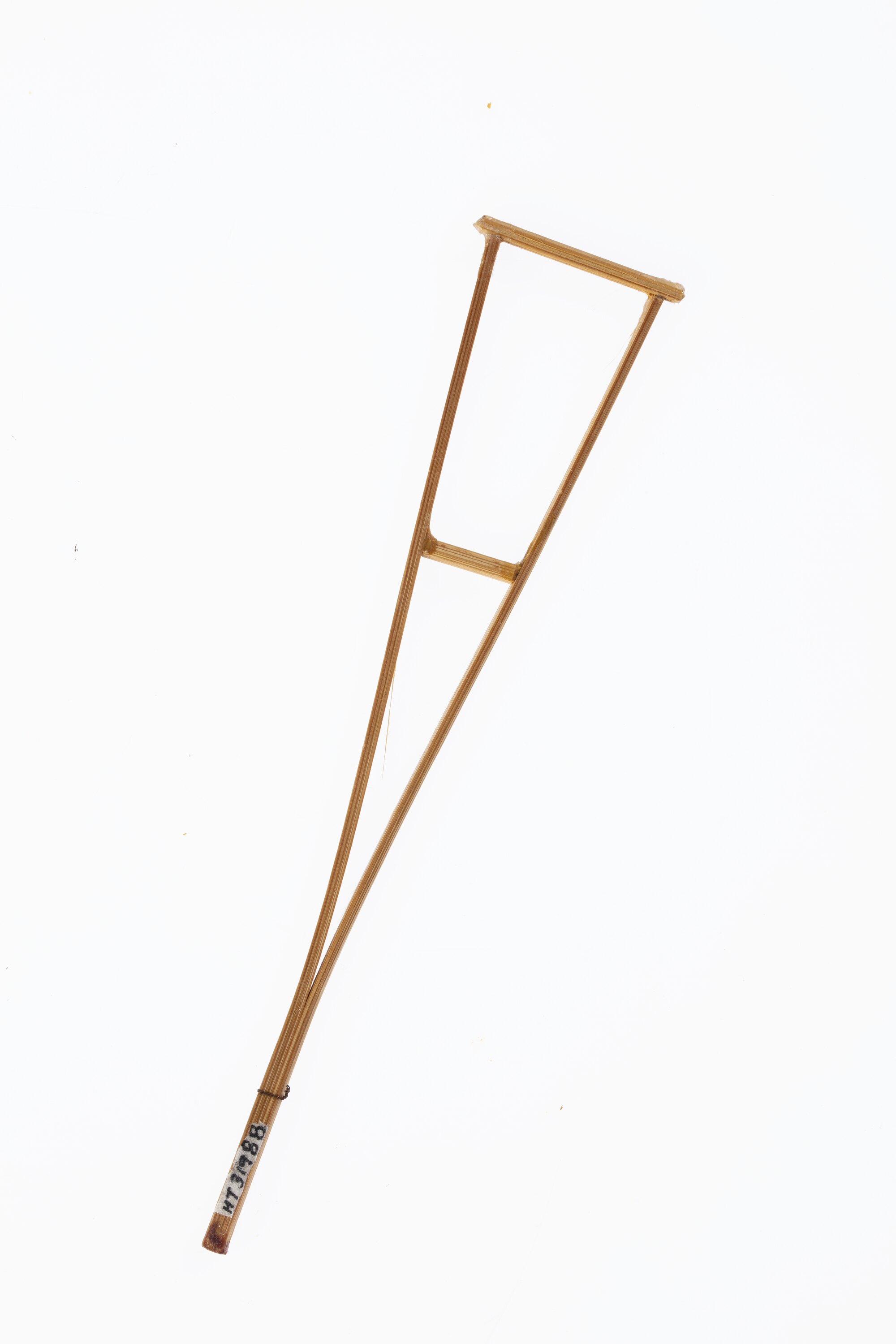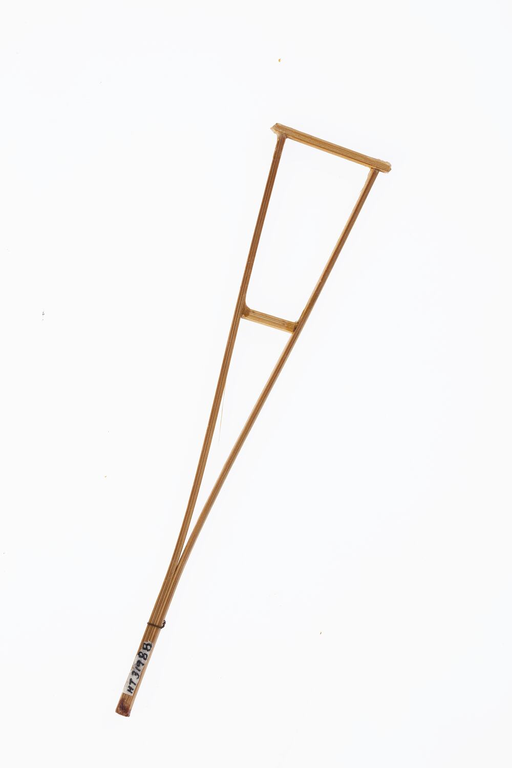 Miniature crutch made from thin mieces of wood, possibly bamboo.