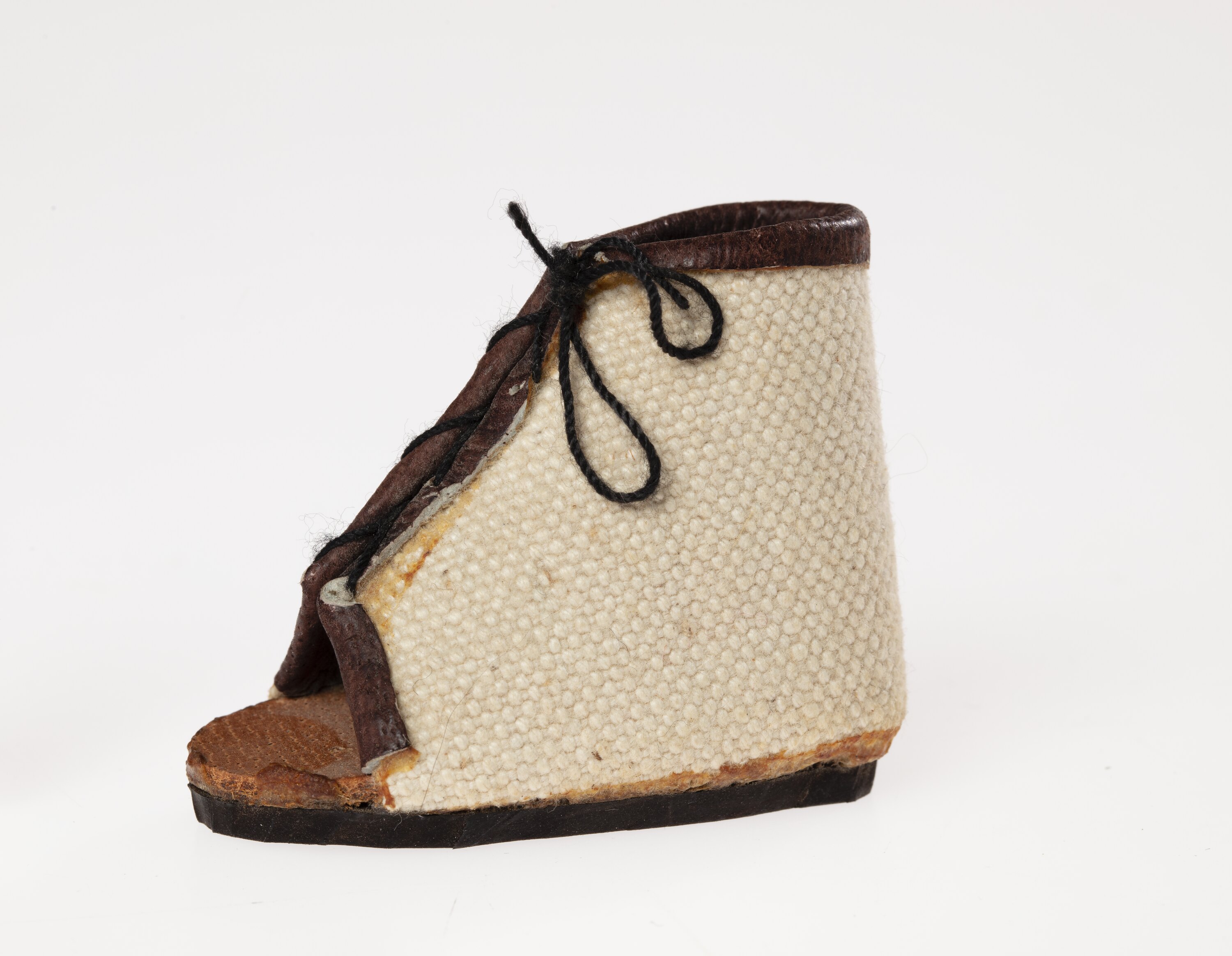 Small model of a prosthetic shoe made from recycled materials. The sole is made from dark brown rubber with a canvas-like white upper, brown leather trim and black cotton shoelaces.There is evidence of a brown glue around the edges.