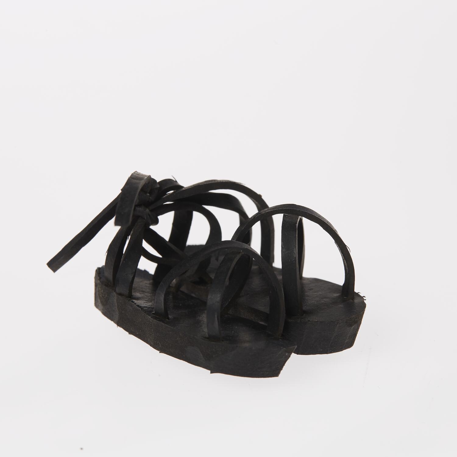 Pair of miniature sandals, the soles and straps are made from recycled black rubber. Straps have been tied or entwined together.