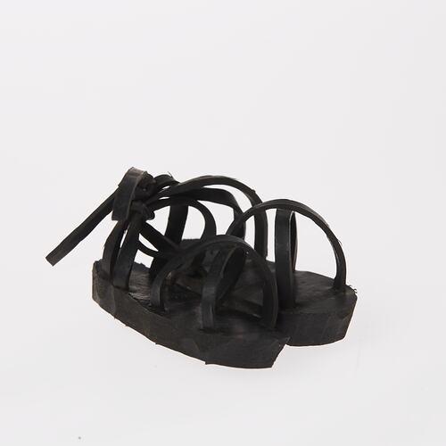 This miniature pair of sandals is one of four miniature items in the collection crafted by Khmer amputees in a prosthetic workshop run by Operation Handicap International, a French aid organisation, in Khao I Dang Camp on the east Thai-Cambodia border. They were collected by Department of Immigration Senior Migration Officer Jennie Roberts, between 1987 and 1989 when she was working in various refugee camps in Thailand.