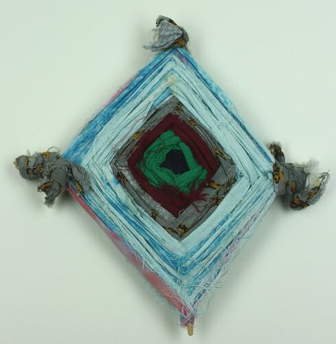 Pair of crossed sticks, interlaced with green, red and grey and blue fabric to form a square. Three of the ends are covered with fraying grey fabric.