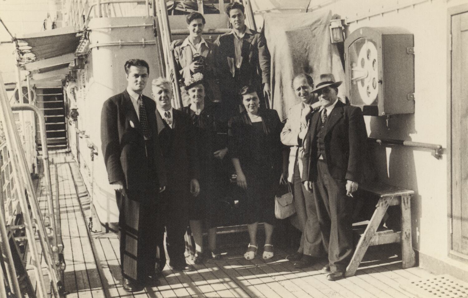 Inscribed on reverse: 'On the Ship, SEBASTINO CABOTO / TOP. FRANK GAGLIADI & COUSIN GOE MINNITI / FROM ITALY / ARRIVED ON THIS SHIP 23-4-1950 / BOTTOM ROW. COLLINS BUTLER - DOMENIC MURATORE (GOING TO ITALY) / MRS. BUTLER - MRS. BOFFA - PROF. GOE MURATORE and DOMENIC GAGLIARDI - / VIC. DOC MELB. 28-4-1950'.