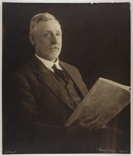 Portrait of Mr John Mitchell, founder of Mitchell & Co., agricultural machinery manufacturer. He is seated and holding a newspaper. He is wearing a suit and tie.