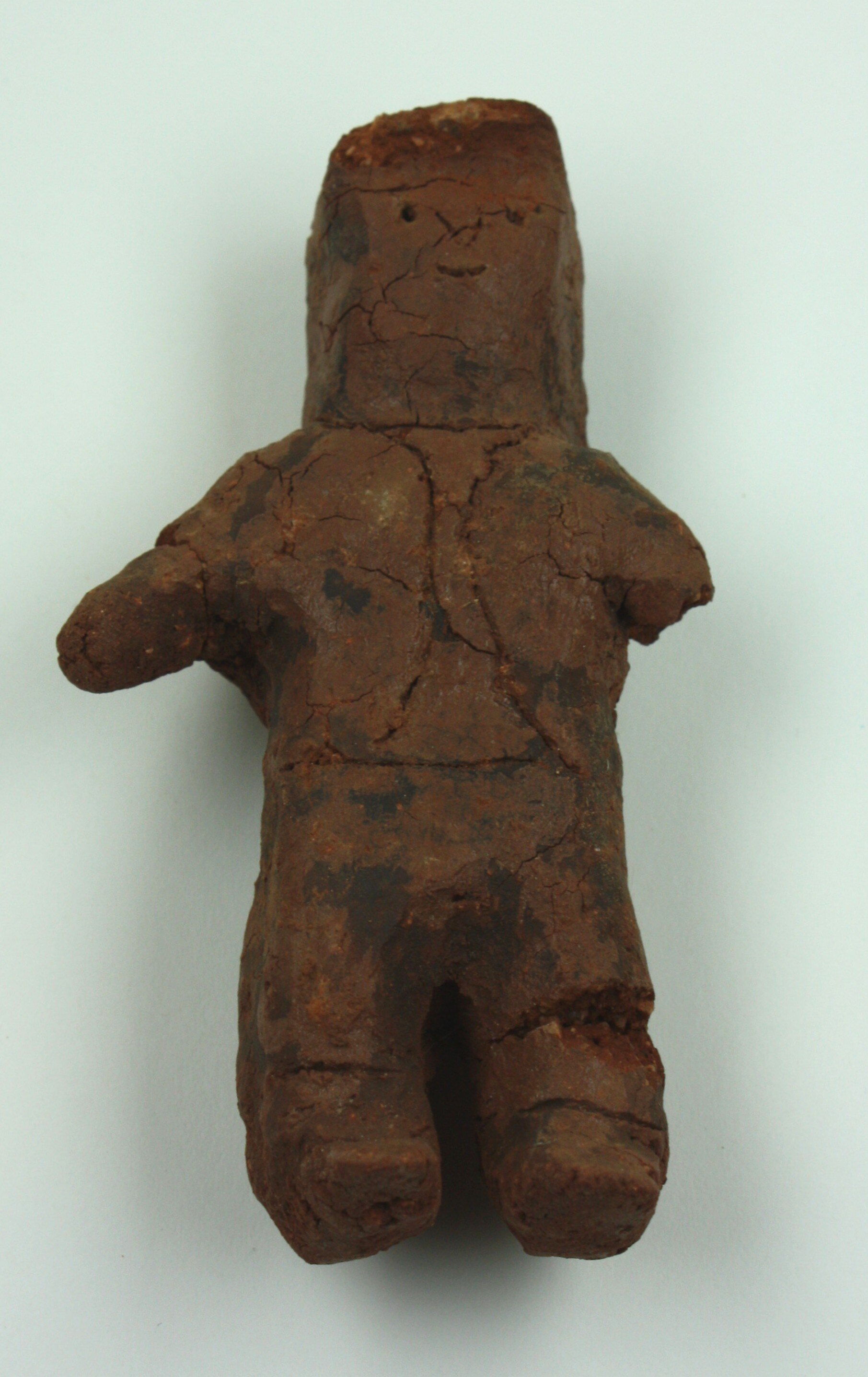 Human figure made from fired terracotta. It is crudely formed, with short legs and arms, and impressions in head for eyes, nose and mouth. Its proper left arm has broken off and is missing.