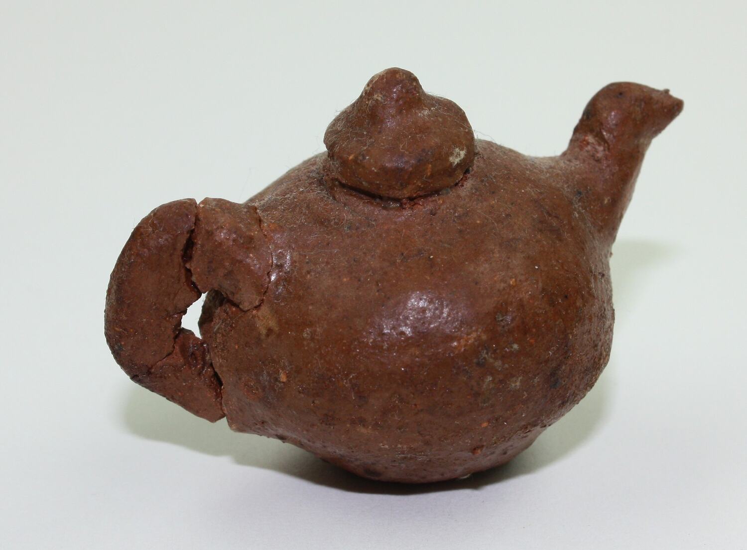 Toy teapot, constructed from natural clay and then fired. It is crudely formed, with circular body and small lid; its curved handle is cracked at top and bottom.