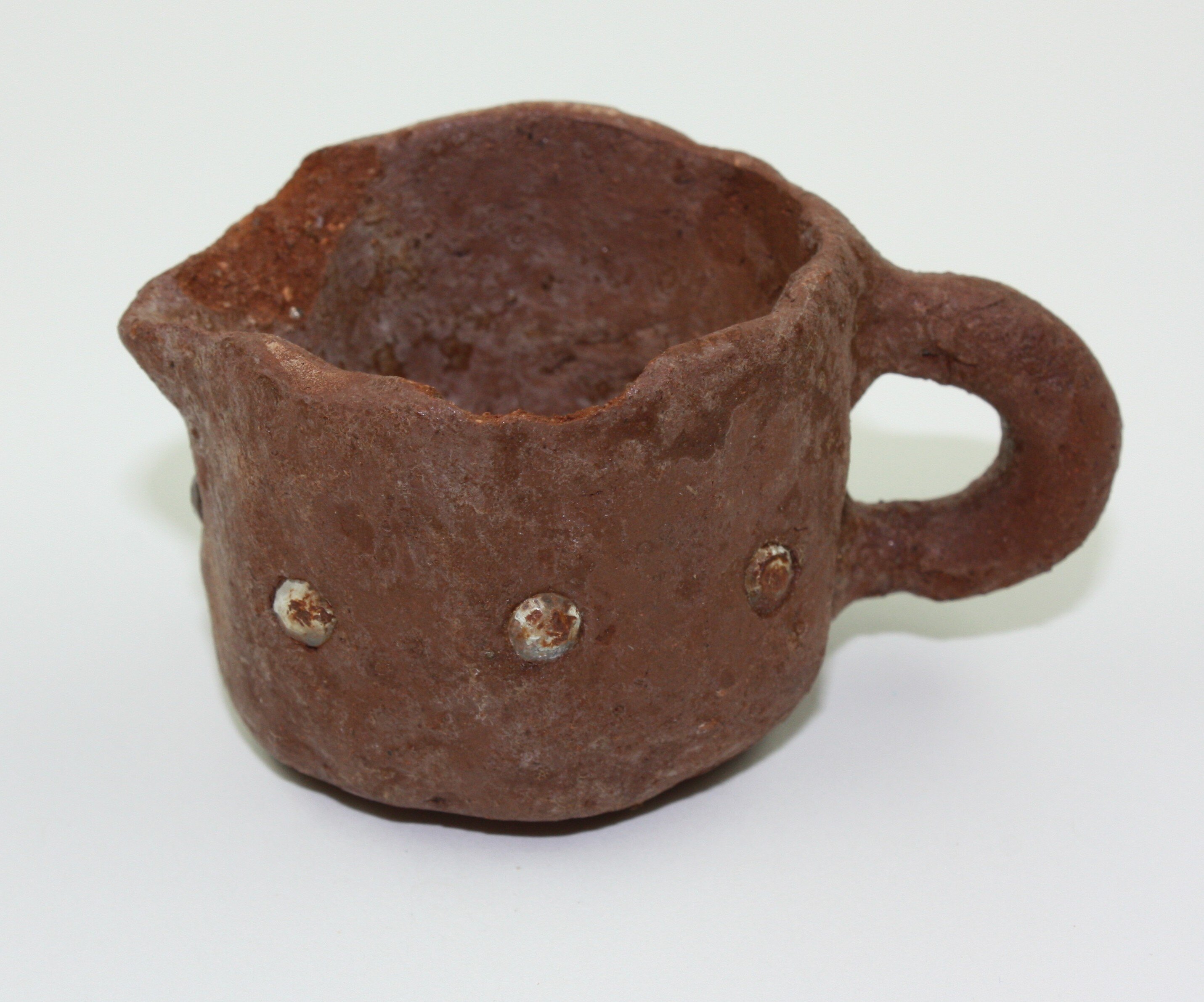 Toy milk pot or jug, crudely formed from natural clay and then fired. It has a circular body with uneven upper rim; a curved handle; and a spout. It is decorated around its body with several small round pieces of plastic.