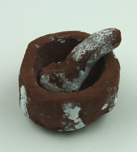 Toy cooking pot and spoon, crudely constructed from natural clay and then fired. The body of the pot is roughly circular; it contains a large, slighly curved 'spoon'. Both have patches of white paint.