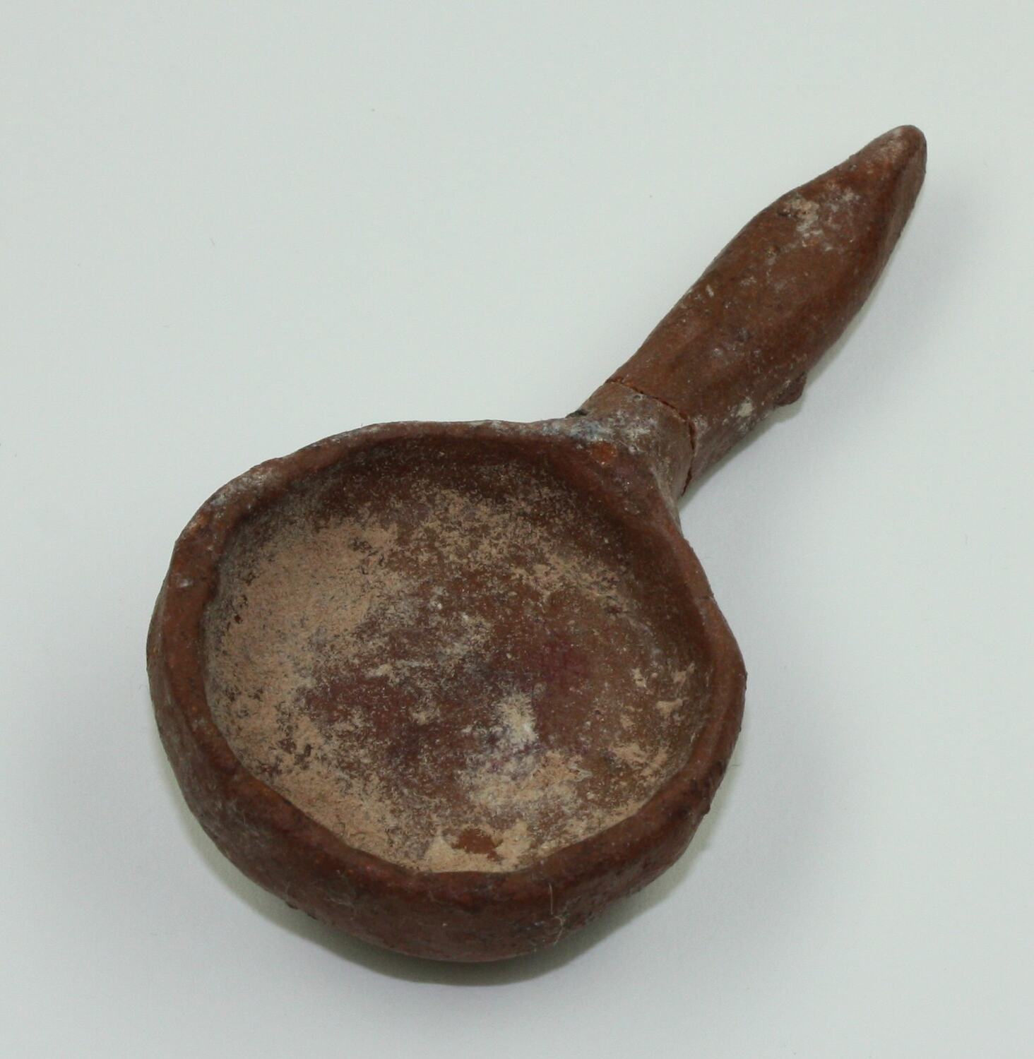 Large toy spoon, roughly constructed from natural clay and then fired. The spoon has a circular bowl and tapering handle, cracked at the join to the bowl.