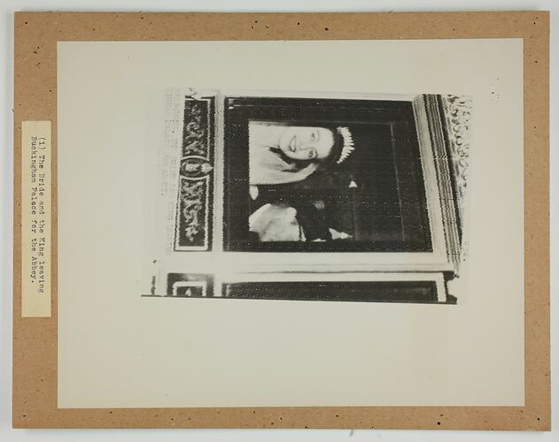 Typed on white paper that is mounted to the board under the picture; '(1) The Bride and the King leaving / Buckingham Palace for the Abbey.'