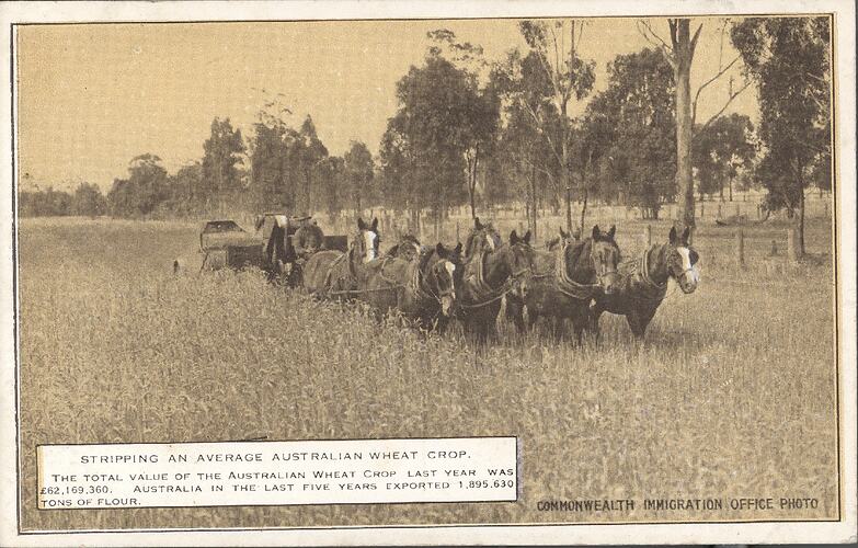 One of a series of postcards issued by the Commonwealth Immigration Office, during the early 1920s, to promote immigration to Australia for rural settlement. This postcard promotes the success of Australia's wheat farmers, depicting a farmer in a paddock harvesting a high standing crop of wheat with a stripper-harvester pulled by a team of eight draught horses. The reference in the caption to the 'Total Value of the Australian Wheat Crop Last Year' being £62,169,360, represents the official production recorded for the 1920-21 season. The reverse side has a outline map of Australia with 'Kinsmen! We Welcome You' printed across it, together with population statistics and a reference to the Australian Pavilion at the British Empire Exhibition, which was held at Wembley, England, from April-October 1924.