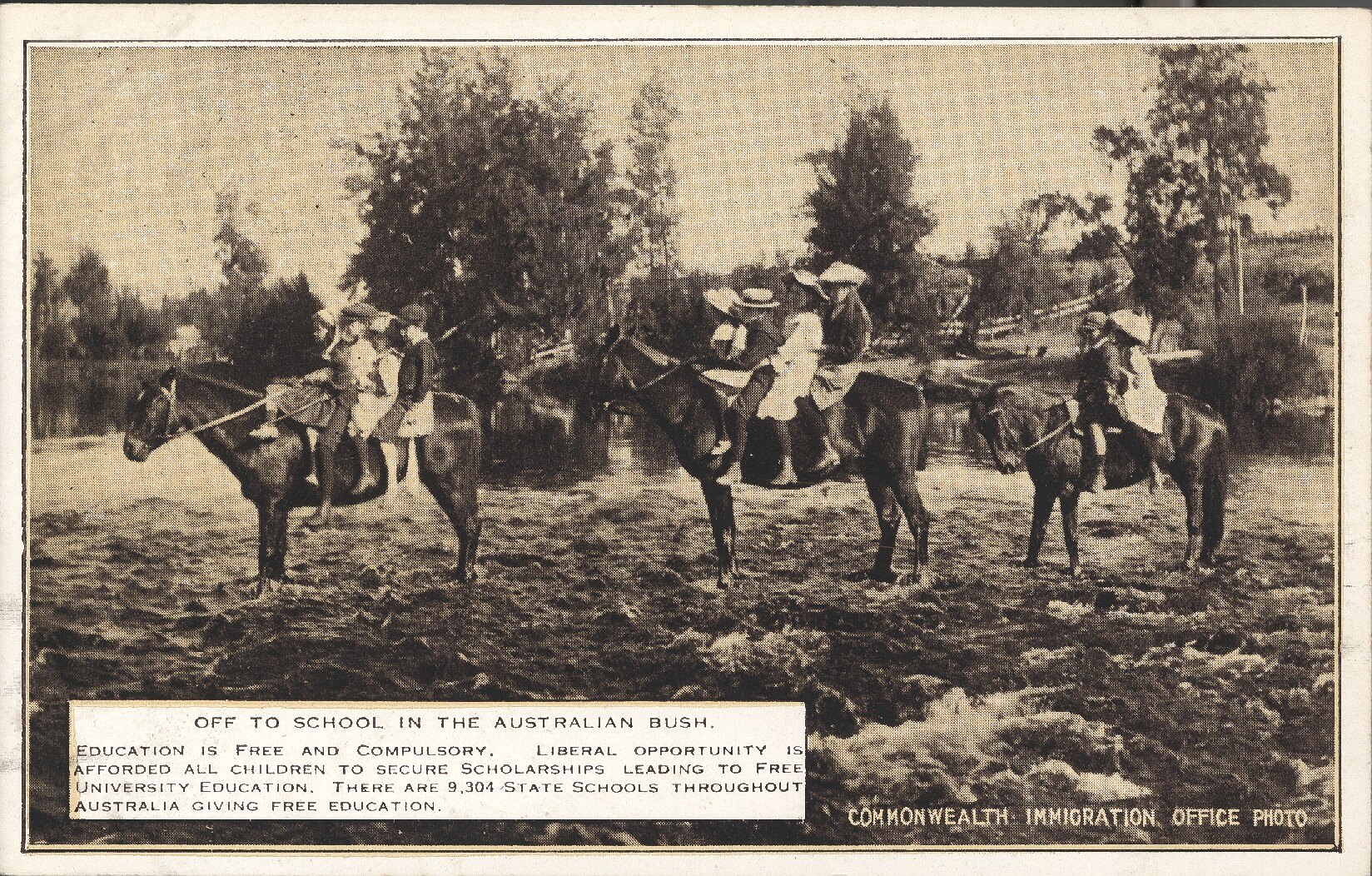 Caption on front of card: 'OFF TO SCHOOL IN THE AUSTRALIAN BUSH./ EDUCATION IS FREE AND COMPULSORY. LIBERAL OPPORTUNITY IS/AFFORDED ALL CHILDREN TO SECURE SCHOLARSHIPS LEADING TO FREE/UNIVERSITY EDUCATION. THERE ARE 9,304 STATE SCHOOLS THROUGHOUT/AUSTRALIA GIVING FREE EDUCATION.' Footer: 'COMMONWEALTH IMMIGRATION OFFICE PHOTO' Reverse: 'Kinsmen! We Welcome You/Visit the Australian Pavilion at British Empire Exhibition at Wembley, and see what Australia and her resources are/PRINTED FOR COMMMONWEALTH IMMIGRATION OFFICE BY ATLAS PRESS PTY. LTD. MELB.'