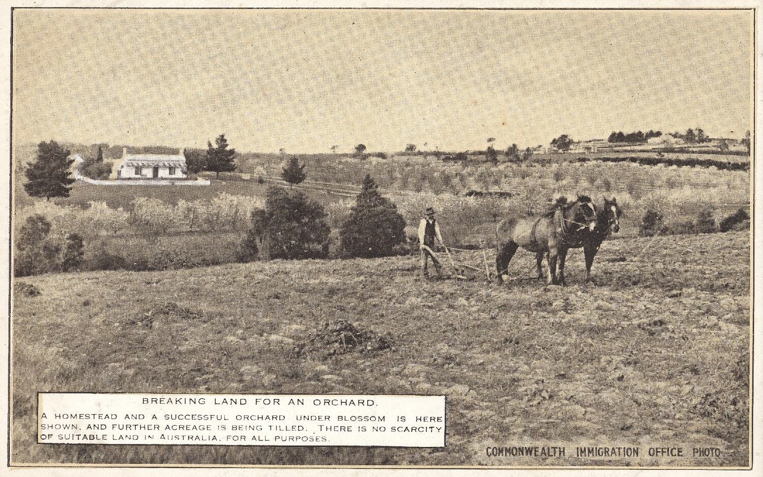 Caption on front of card: 'BREAKING LAND FOR AN ORCHARD./ A HOMESTEAD AND A SUCCESSFUL ORCHARD UNDER BLOSSOM IS HERE/ SHOWN, AND FURTHER ACREAGE IS BEING TILLED. THERE IS NO SCARCITY/ OF SUITABLE LAND IN AUSTRALIA, FOR ALL PURPOSES.' Footer: 'COMMONWEALTH IMMIGRATION OFFICE PHOTO' Reverse: 'Kinsmen! We Welcome You/Visit the Australian Pavilion at British Empire Exhibition at Wembley, and see what Australia and her resources are/PRINTED FOR COMMMONWEALTH IMMIGRATION OFFICE BY ATLAS PRESS PTY. LTD. MELB.'