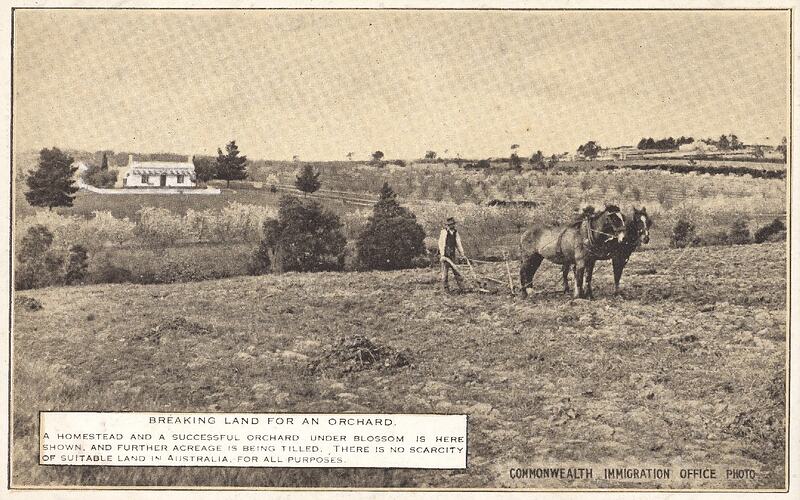 One of a series of postcards issued by the Commonwealth Immigration Office, during the early 1920s, to promote immigration to Australia for rural settlement. This postcard promotes rural land settlement in Australia, referring to orcharding. The scene shows a neat, double-fronted, whitewashed homestead in the distance, to the side of which there is an established orchard block. In the foreground a farmer is ploughing an open field with a single-furrow mouldboard plough and two-horse team. The reverse side has a outline map of Australia with 'Kinsmen! We Welcome You' printed across it, together with population statistics and a reference to the Australian Pavilion at the British Empire Exhibition, which was held at Wembley, England, from April-October 1924.
