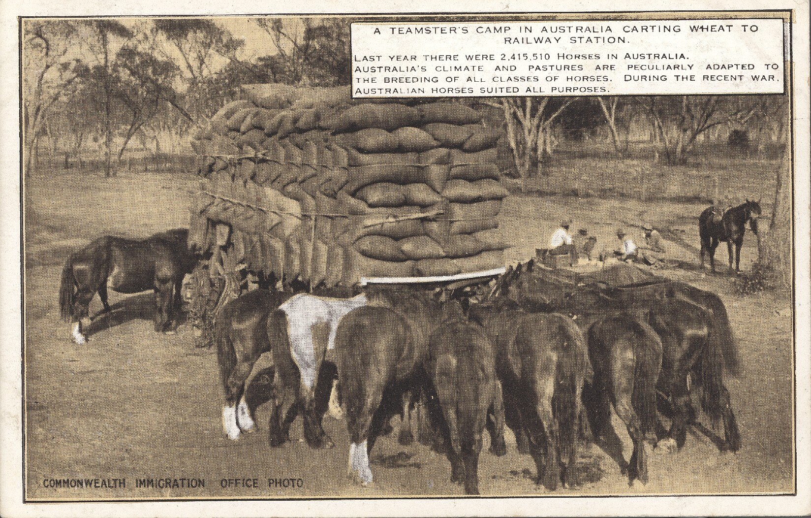 Caption on front of card: 'A TEAMSTER'S CAMP IN AUSTRLAIA CARTING WHEAT TO/ RAILWAY STATION. / LAST YEAR THERE WERE 2,415,510 HORSES IN AUSTRALIA. / AUSTRALIA'S CLIMATE AND PASTURES ARE PECULIARLY ADAPTED TO / THE BREEDING OF ALL CLASSES OF HORSES. DURING THE RECENT WAR, / AUSTRALIAN HORSES SUITED ALL PURPOSES.' Footer: 'COMMONWEALTH IMMIGRATION OFFICE PHOTO' Reverse: 'Kinsmen! We Welcome You/Visit the Australian Pavilion at British Empire Exhibition at Wembley, and see what Australia and her resources are/PRINTED FOR COMMMONWEALTH IMMIGRATION OFFICE BY ATLAS PRESS PTY, LTD, MELB.'