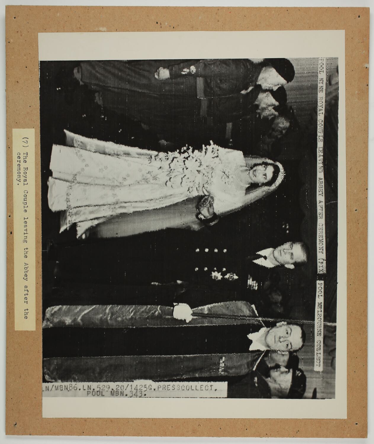Typed on white paper that is mounted to the board under the picture; '(7) The Royal Couple leaving the Abbey after the / ceremony.' Printed above the picture; 'LN/MBN86.LN.529.20/1425G. PRESSCOLLECT. / POOL MBN.343.'
