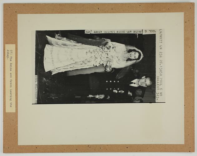 Typed on white paper that is mounted to the board under the picture; '(8) The Bride and Groom leaving the / Abbey.' Printed above the picture; 'LN/MBN77 LN 234 20.1345G POOL 6 MB / COLLECT 343.'