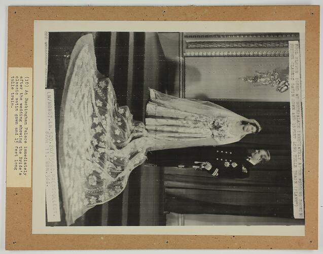 Typed on white paper that is mounted to the board under the picture; '(10) At Buckingham Palace immediately / after the wedding showing the Bride's / classic satin gown and 15 feet long / tulle train.' Printed under the picture; 'LN/MBN87.LN.520.20.1550G PRESSCOLLECT. / POOL 11. MBN.334.'