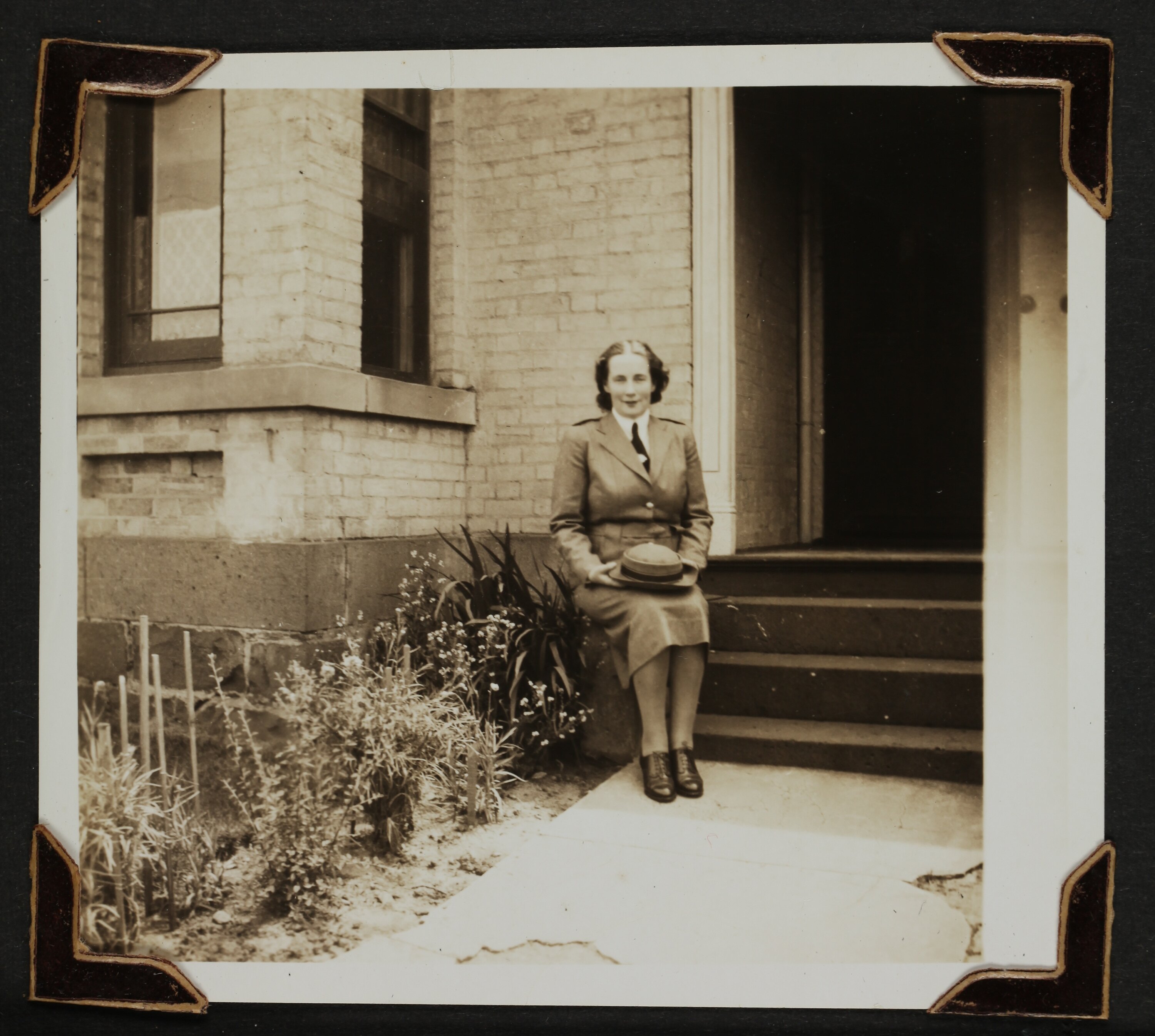 Portrait of Isabel Erskine Plante in uniform holding her hat. She is sitting on a pillar outside a house at Essendon.